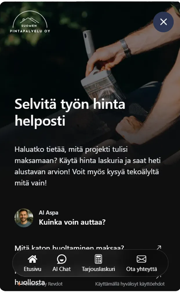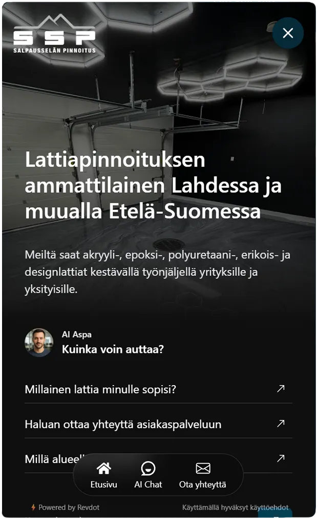Ota yhteyttä ja varaa maksuton demo. Rakennamme sinulle AI Chatbotin yrityksesi näköisenä ja verkkosivujesi tiedoilla koulutettuna