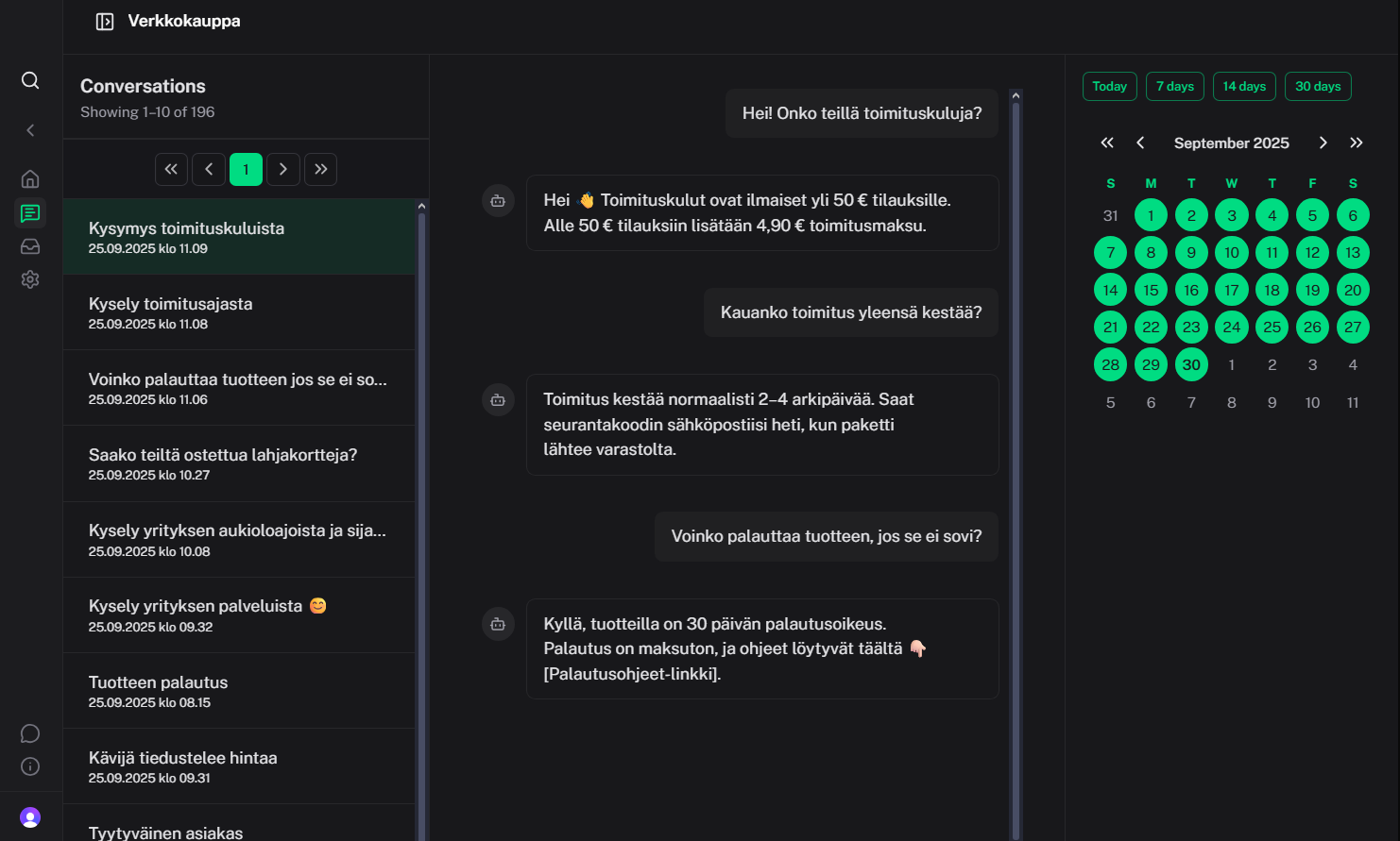 Tekoäly hoitaa toistuvat kysymykset 24/7, vapauttaa tiimiltä aikaa myyntiin ja parantaa asiakaskokemusta. Näet tulokset selkeästi dashboardista